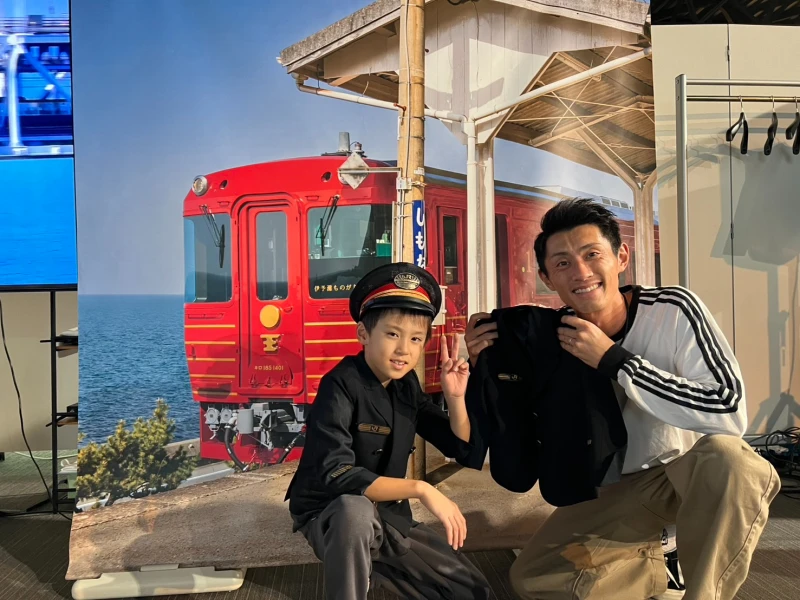 ゆうし君👦は駅員さんの制服を試着したり、館内に響く汽笛を聞いたり