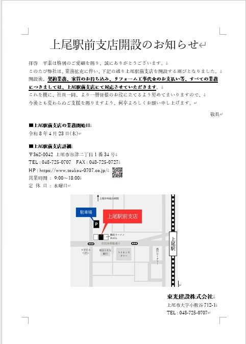 弊社東光建設株式会社は、業務拡充に伴い上尾駅前支店を開設する運びとなりました